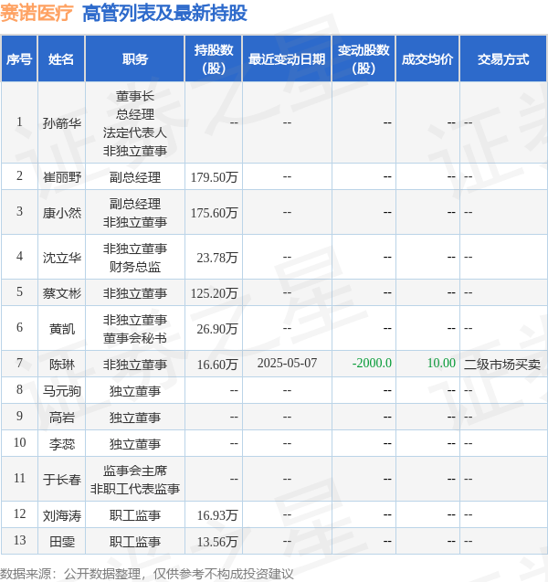 赛诺医疗的高管列表及最新持股情况如下: